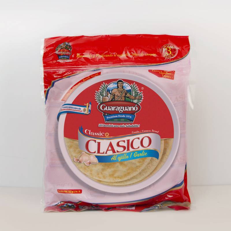 -El pionero y auténtico Casabe Al Ajillo. -Libre de Gluten, Apto para Celiacos,Apto para dieta veganas, paleo, Rico en Fibras. -Su presentación en Bolsas resellable perfecto para comer y guardar para después, con su tamano Familiar 8 OZ, podrás llevarlos a cualquier parte. -Contiene 3 Lonjas.